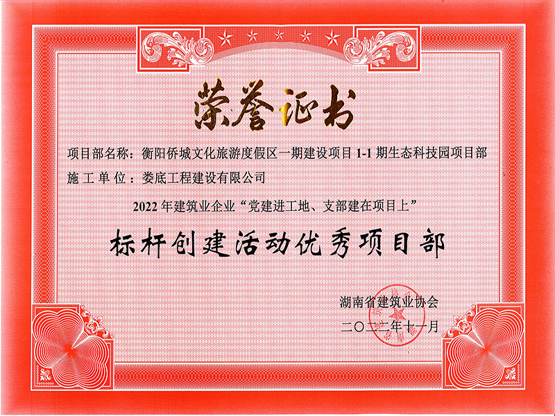 2022年衡陽僑城文化旅游度假區(qū)一期生態(tài)科技園項目標(biāo)桿創(chuàng)建活動優(yōu)秀項目部榮譽證書