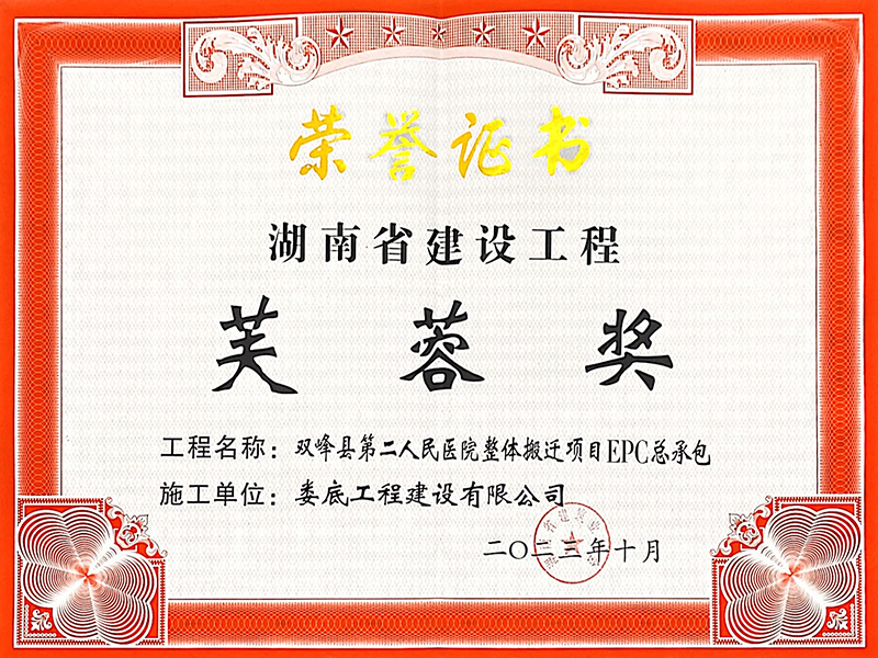 2022年度雙峰縣第二人民醫(yī)院整體搬遷EPC總承包項目芙蓉獎榮譽證書