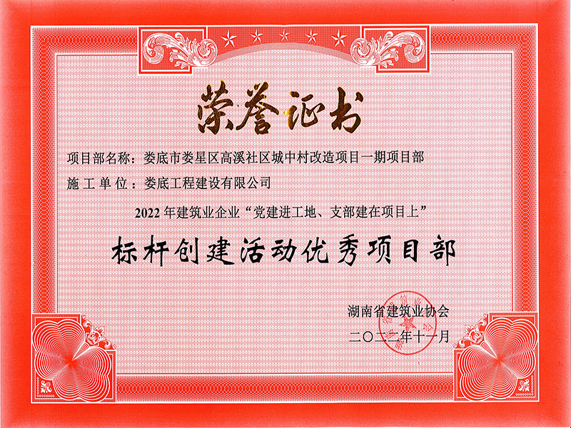 2022年婁底市婁星區(qū)高溪社區(qū)城中村改造項目標桿創(chuàng)建優(yōu)秀項目部榮譽證書