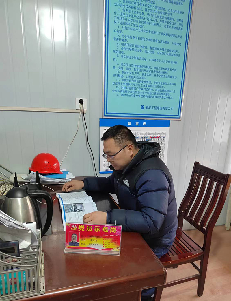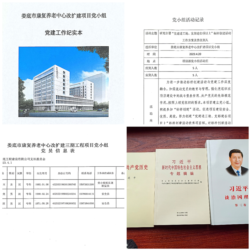 公司黨支部秉承“抓黨建就是抓生產(chǎn)力”的理念,全力推進(jìn)“黨建進(jìn)工地、支部建在項(xiàng)目上”標(biāo)桿創(chuàng)建活動(dòng),努力實(shí)現(xiàn)“生產(chǎn)一線有黨員、業(yè)務(wù)骨干是黨員、關(guān)鍵時(shí)刻看黨員”的工作目標(biāo)。于2023年4月1日成立婁底市康復(fù)養(yǎng)老中心改擴(kuò)建項(xiàng)目黨小組,現(xiàn)有正式黨員3名。項(xiàng)目部設(shè)有專門的黨建活動(dòng)場(chǎng)所,黨組織標(biāo)識(shí)牌、黨旗、入黨誓詞等全部設(shè)置在顯目位置。場(chǎng)外設(shè)置了專門的黨建宣傳欄。