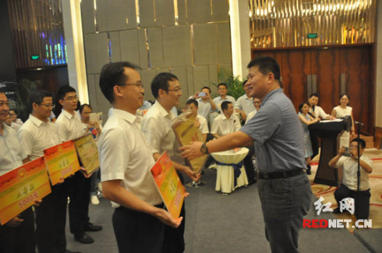 (湖南省住房和城鄉(xiāng)建設廳副廳長姚英杰為第一名張家界代表隊頒獎。)