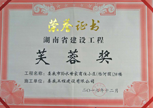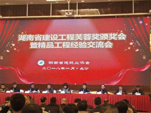 2018年1月19日,由湖南省建筑業(yè)協(xié)會(huì)舉辦的湖南省建設(shè)工程芙蓉獎(jiǎng)?lì)C獎(jiǎng)會(huì)暨精品工程經(jīng)驗(yàn)交流會(huì)在長沙舉行。我司承建的婁底市孫水世家商住小區(qū)(怡河園)2#樓獲得湖南省建設(shè)工程質(zhì)量最高獎(jiǎng)—“芙蓉獎(jiǎng)”殊榮。這是我司自市農(nóng)業(yè)銀行綜合樓、市委市人民政府辦公樓1#、6#、7#、雙峰縣體育中心體育館喜獲“芙蓉獎(jiǎng)”后,第四次獲得“芙蓉獎(jiǎng)”殊榮。