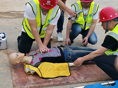 搶救組將傷員移至安全地帶,醫(yī)療救護(hù)組人員檢查傷員情況后,組織組對(duì)傷員進(jìn)行了左小腿夾板和繃帶固定綁扎,并對(duì)傷員進(jìn)行心肺復(fù)蘇和人工呼吸等急救救治。